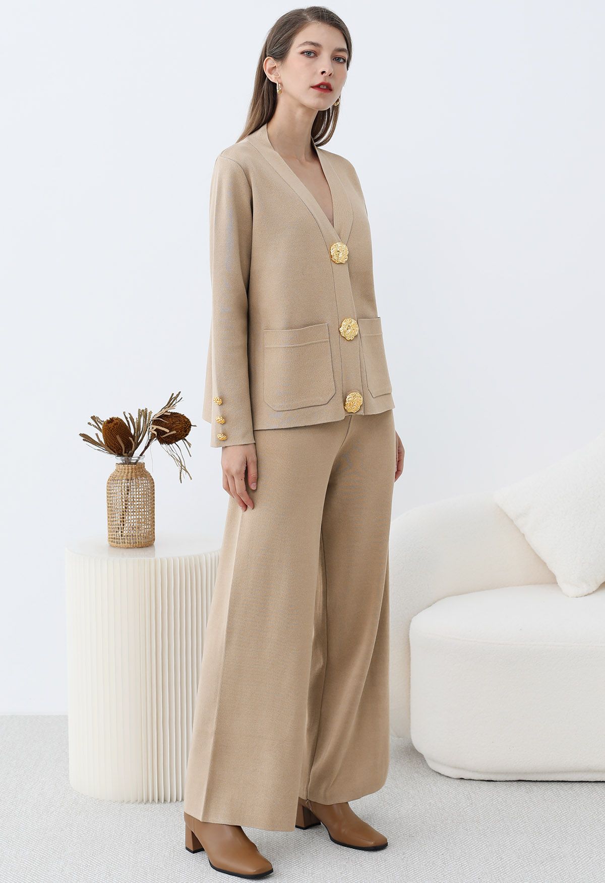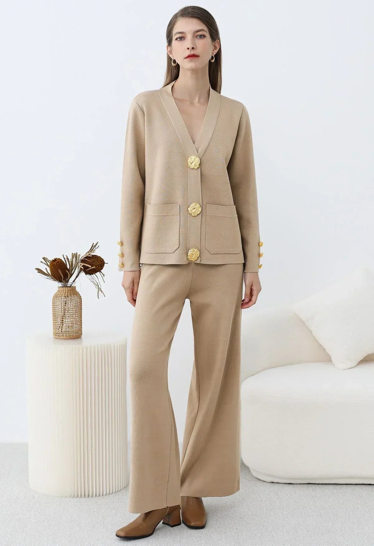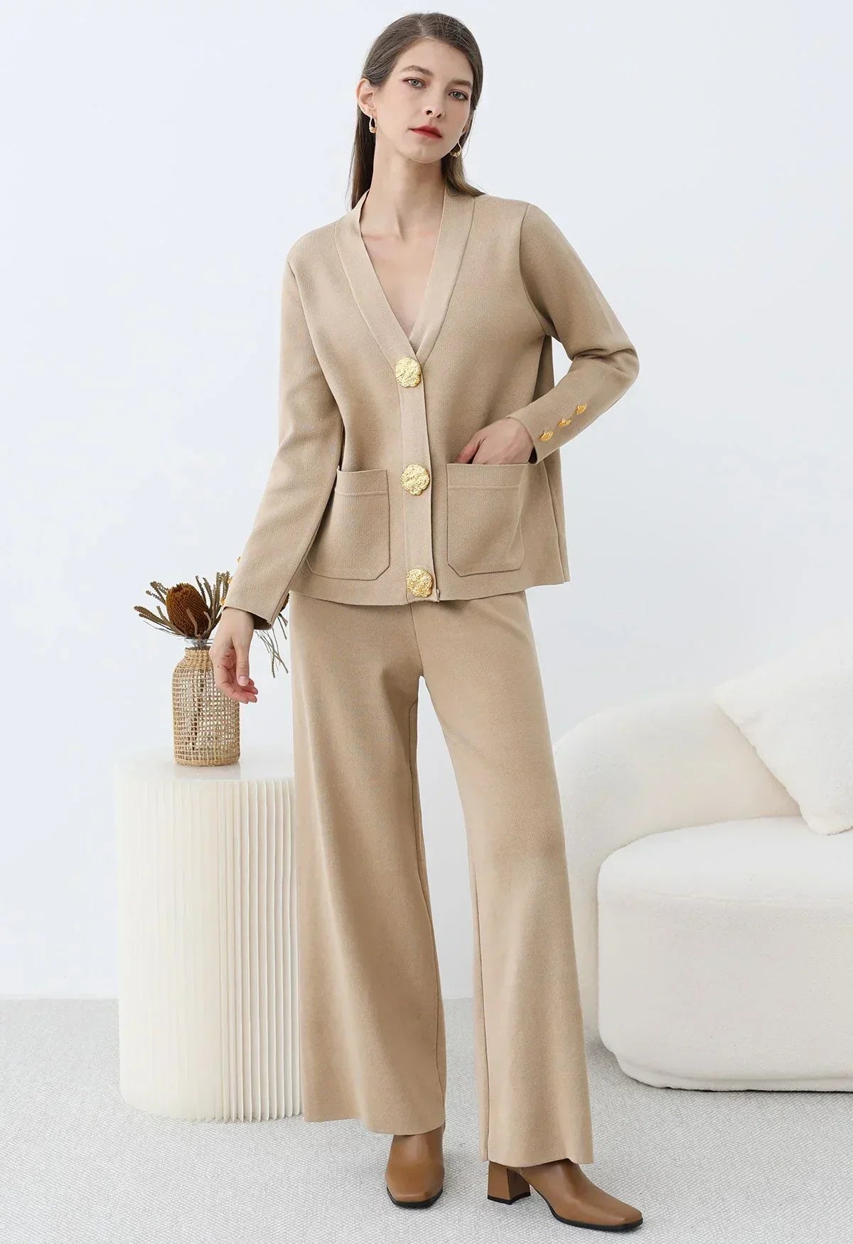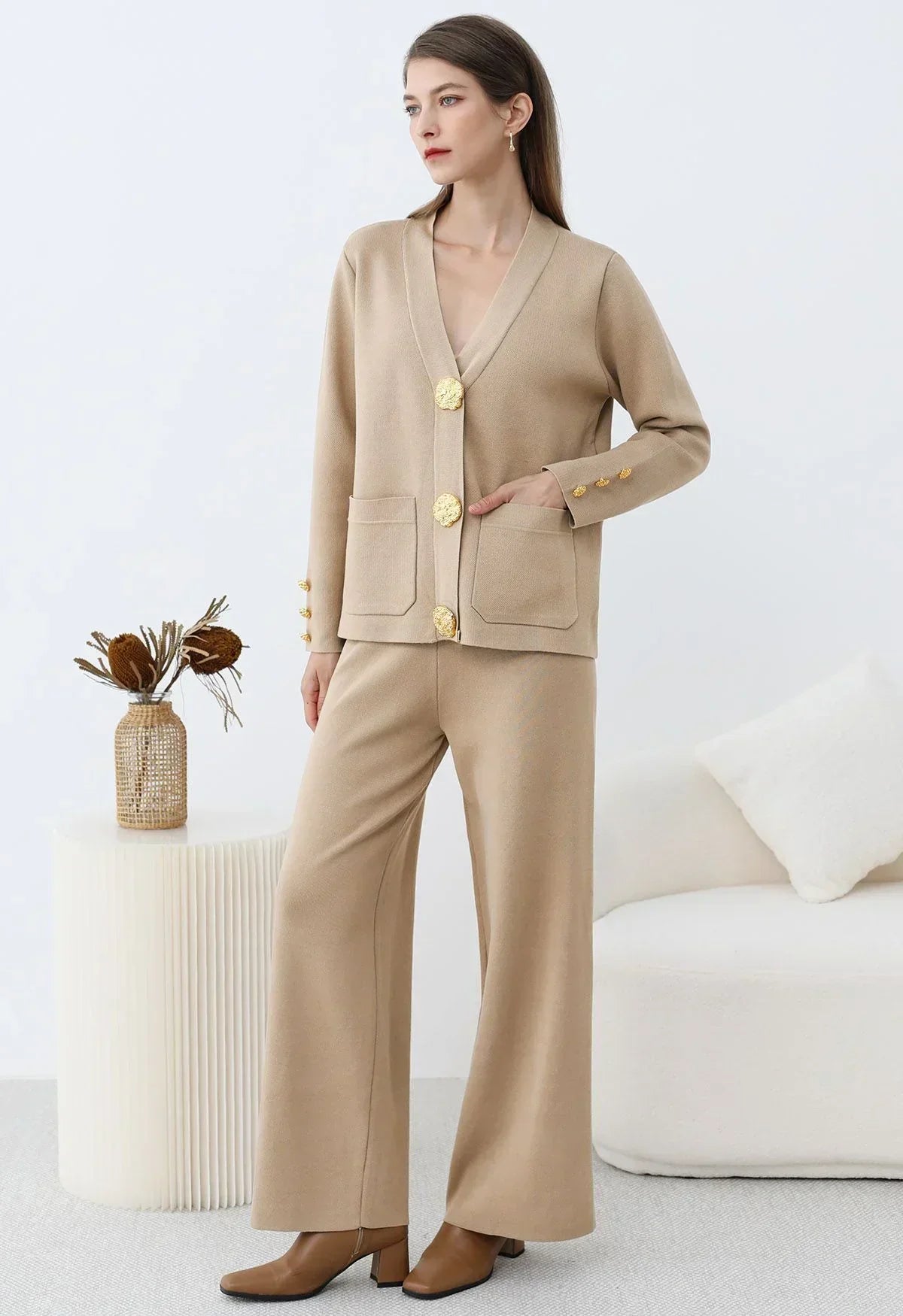 Affichez un luxe discret avec cet ensemble cardigan et pantalon en tricot, conçu pour allier raffinement et bien-être. Son design sophistiqué, agrémenté de boutons dorés et de poches plaquées, apporte une touche chic et intemporelle à votre garde-robe.