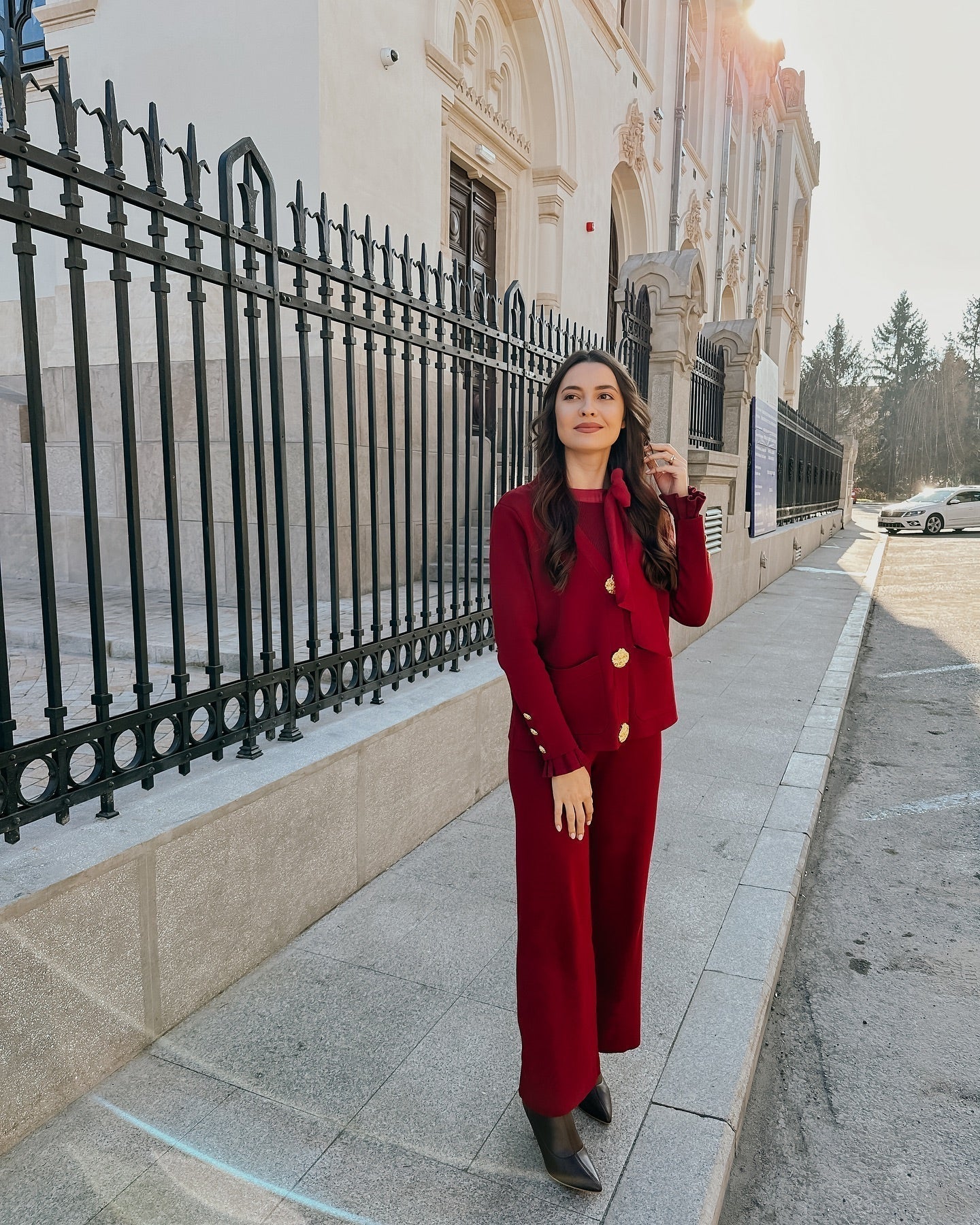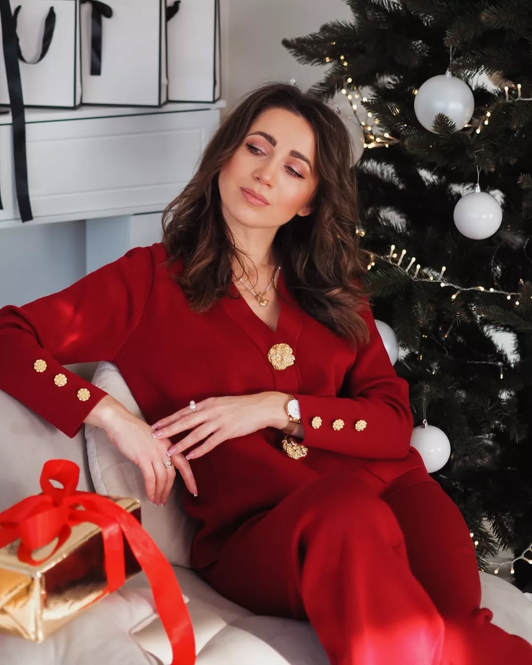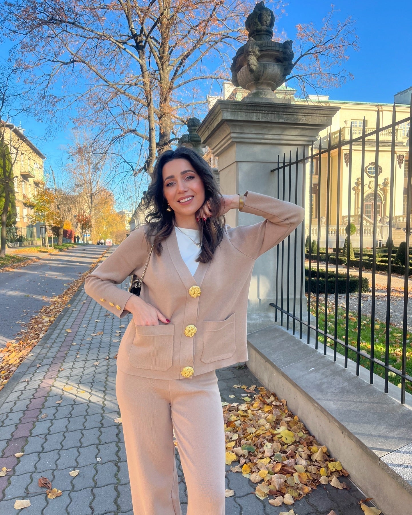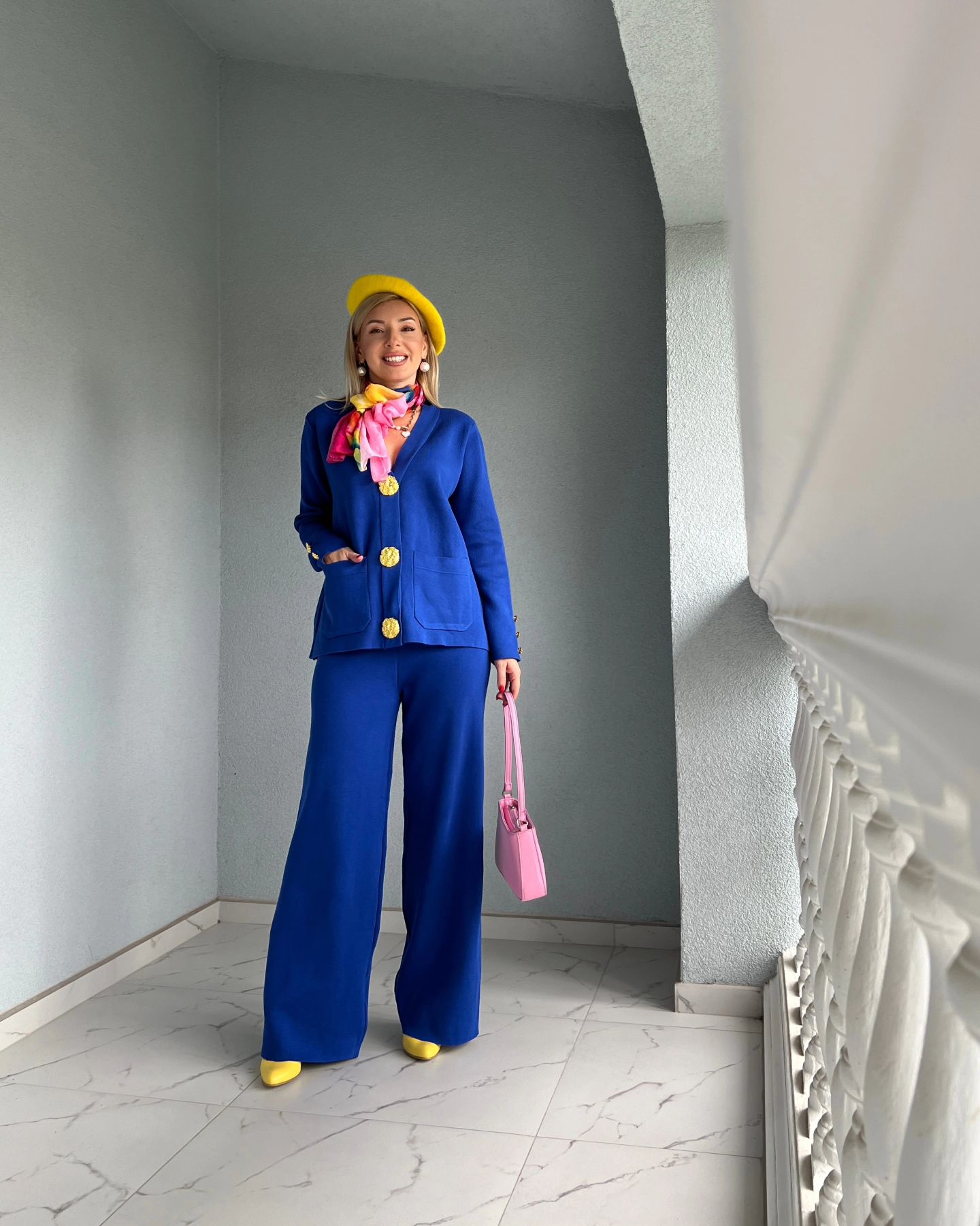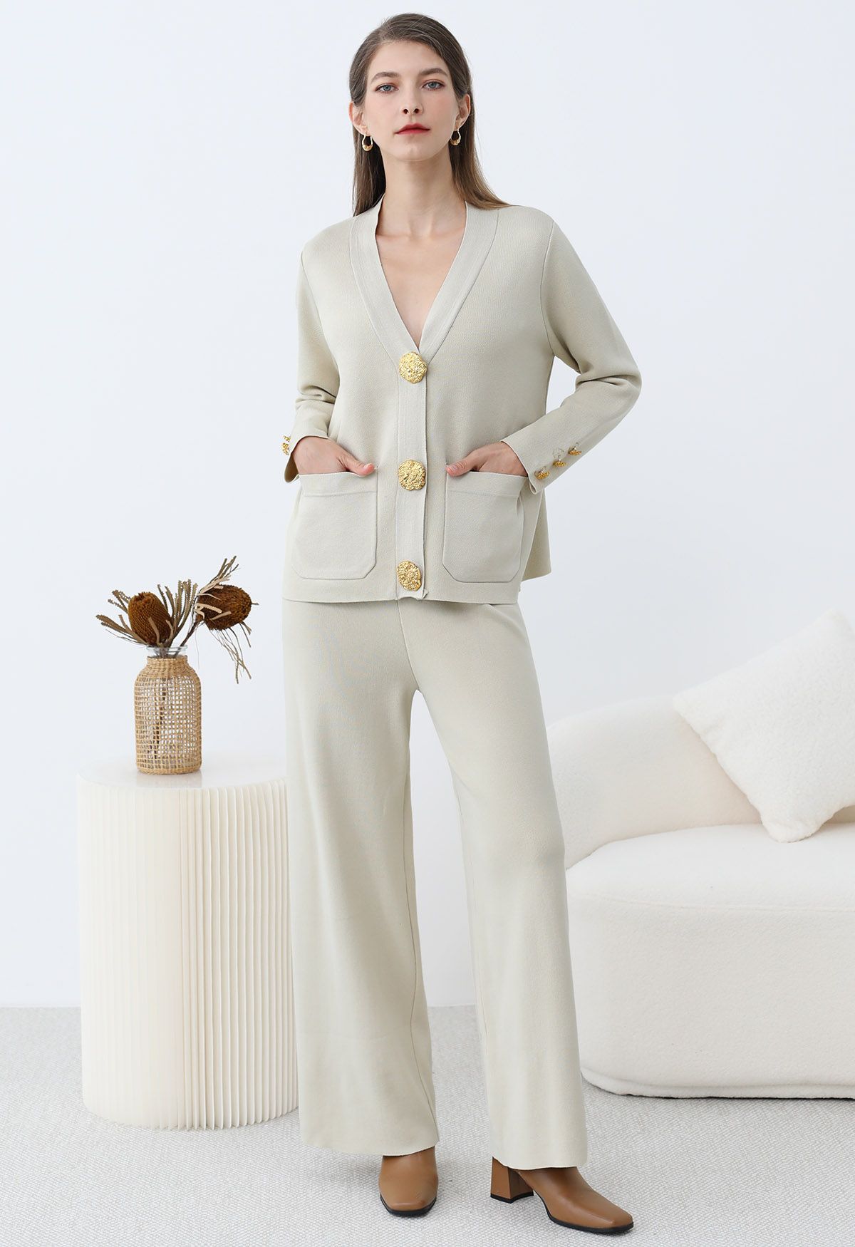 Affichez un luxe discret avec cet ensemble cardigan et pantalon en tricot, conçu pour allier raffinement et bien-être. Son design sophistiqué, agrémenté de boutons dorés et de poches plaquées, apporte une touche chic et intemporelle à votre garde-robe.